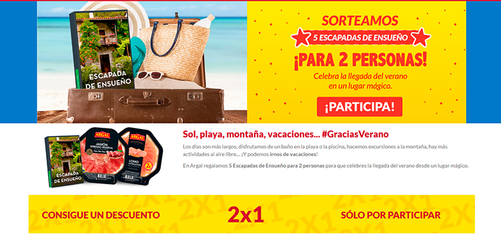 Para celebrar la llegada del verano en un lugar mágico, ¡Argal sortea 5 escapadas de ensueño para dos personas! En verano los días son más largos, perfectos para disfrutar de un baño en la playa o la piscina, excursiones a la montaña, actividades al aire libre, vacaciones… Y por ello, Argal sortea 5 escapadas de ensueño para dos personas 🙂 En concreto, entre todos los que participen regalarán 5 cofres VIP “Escapadas de ensueño”. Y sólo por participar conseguirás ¡un rebaja de 2×1 en productos Argal! Con el pagas uno y te regalan otro. Esta promoción es válida en toda…