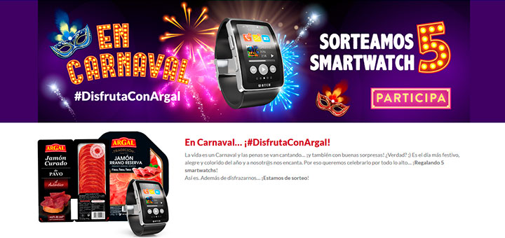 Este Carnaval ¡Argal sortea 5 Smartwatchs! Tal como comentan y dice la canción “La vida es un Carnaval y las penas se van cantando…” Y también con buenas sorpresas 🙂 Se podría decir que el Carnaval es el día más festivo, alegre y colorido del año, y a esta marca les encanta. Por eso quieren celebrarlo por todo lo alto, ¡regalando 5 smartwatchs! Lo que, es una buena oportunidad para disfrazarse este año y entrar en este fantástico sorteo. Además, por solo participar te llevarás un cupón rebaja 2×1 válido para productos Argal: Paga uno y te regalan otro :p…
