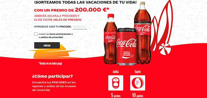 Atent@ a esto porque… ¡Coca Cola sortea todas las vacaciones de tu vida y reparte increíbles regalos! Coca Cola nos tiene preparada esta promoción llamada “Siente el verano“, en el que sortea todas las vacaciones de tu vida con un premio de 200.000€ y reparte increíbles regalos. La mecánica de participación es muy sencilla ya que sólo hay que acumular pincodes encontrados en las anillas y tapones de los productos promocionales y después elegir entre miles de grandes premio. Un Pincode impreso en anilla equivale a 5 puntos y el Pincode impreso en tapón 10 puntos. Hay un montón de grandes premio…