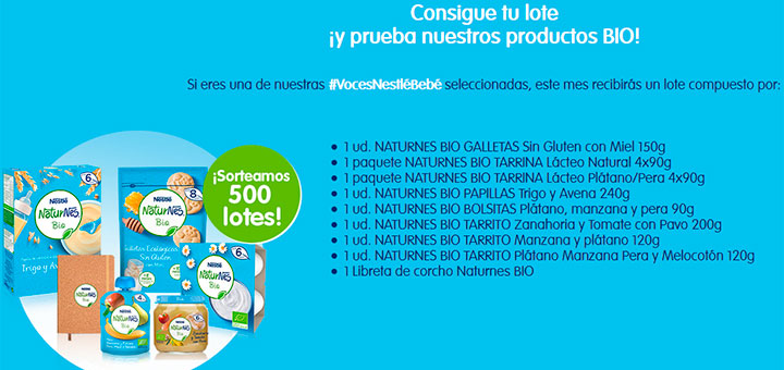 Nestlé Bebé estrena el mes de abril con este maravilloso sorteo en el que reparte ¡300 lotes de Naturnes Bio! Para bebés entre 6 y 24 meses. Como te vamos contando a menudo, Nestlé Bebé seleccionan a menudo un número determinado de testador@s como Voces Nestlé para que prueben gratis sus productos y compartan su opinión sobre ellos con otras mamás y papás. Según el mes, los productos que regalan podrán ser distintos :p Este mes, cada lote Nestlé que reparten estará compuesto por: 1 Naturnes Bio Tarrina Lácteo Natural 4x90g, 1 Naturnes Bio Galletas Sin Gluten Manzana 150g, 1 Naturnes…