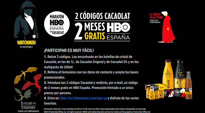 ¿Te gusta ver series y películas? Si es que sí no te pierdas esta promoción de Cacaolat porque podrás disfrutar de ¡2 meses de HBO gratis! Los 2 meses de HBO gratis que reparten es un regalo seguro, y lo podrás conseguir adquiriendo 2 botellas promocionales de Cacaolat, donde encontrarás 2 códigos con los que […]