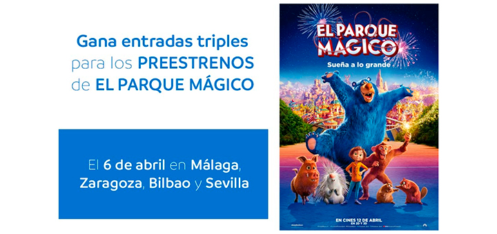 Con esta promoción de Mayoral se podrá obtiener ¡entradas triples para los preestrenos de El Parque Mágico y otros grandes premio! Esta divertida y familiar película de animación “para soñar a lo grande” se estrena el día 12 de abril pero el 6 de abril se preestrena en algunas ciudades de España 🙂 Pues bien, entre aquellos que participen en esta promoción repartirán 25 unidades del juguete de Funrise “Huggable Boomer”, y 371 packs de 3 entradas de cine válidas para los preestrenos que tendrán lugar el día 6 de abril en Málaga (85 entradas triples), Zaragoza (121 entradas triples), Bilbao…