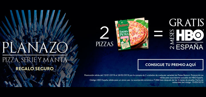 No te pierdas esto porque podrás disfrutar de ¡2 meses gratis de HBO con Buitoni! Por sólo comprar 2 pizzas de la gama Buitoni y participar podrás conseguir un regalo seguro consistente en 2 meses de suscripción HBO gratis 🙂 Ideal para disfrutar de pizza, serie y manta ¡un gran planazo! Hay una gran variedad de pizzas a elegir: Forno Di Pietra, Fina, Micro, Sin Gluten, Piccolinis, Piccolinis Dal Mondo, Bella Napoli, American Style, Rustipani y La Pizzería. Qué hambre da :p Esta promoción es válida en toda España hasta el día 28 de febrero de 2019. Para disfrutar de 2…