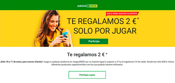 Atent@ a esto porque ¡Juegos ONCE te regala 2€ sólo por jugar! Y es que, solo por jugar 2 € en cualquier producto de JuegosONCE, te regalan 2 €. Así, podrás obtiener sueldos de 5.000 € al mes con el Sueldazo del Fin de Semana, 1.000.000 € al instante con el rasca Mega Millonario, botes de hasta 90.000.000 € con el Eurojackpot… y ¡muchos grandes premio más! Es un gran premio para comenzar enero con regalos e ilusiones 🙂 Esta promoción es limitada: ¡Hasta el 11 de enero de 2019, para nuevos clientes! Si quieres conseguir 2€ por sólo jugar con…