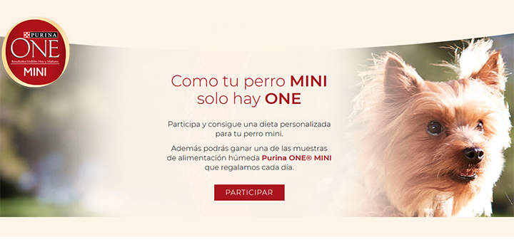 Desde hace poco, Nestlé Purina está repartiendo ¡muestras gratis de Purina ONE Mini alimentación húmeda para perros! Se trata de una gama de productos que aporta a tu perro mini una dieta personalizada. Pues bien, entre todos los que participen en esta promo repartirán muestras gratis cada día de estas variedades Purina ONE Mini, según las características del perro: Adult (100gr), Weight Control (100gr), Active (100gr) y Delicate (100gr). En total, regalarán por momento obtienedor ¡5.000 muestras gratis! Hay para participar hasta el 29 de junio de 2019. Para poder probar gratis las nuevas recetas en salsa Purina One Mini…