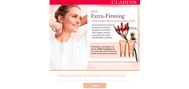 Aprovecha esta promoción de Clarins con la que reparten ¡muestras gratis del dúo Extra-Firming día & noche! Consiste en un dúo innovador que contiene más de 8 extractos de plantas, entre ellas la Flor Canguro, que activa la regeneración de la piel, devolviendole su firmeza y elasticidad. ¡Y ahora sortean 7.900 muestras de 5ml para que los afortunad@s lo puedan probar gratis! Ya son muchos los que han participado :p Este sorteo terminará el día 31 de diciembre de 2018. Para conseguir una de las muestras gratis del dúo Extra-Firming de Clarins que sortean puedes hacer lo siguiente: Visitar la…
