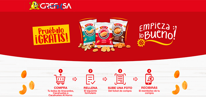 Es genial saber que ¡dan a probar gratis Grefusa Frutos Secos! A través de reembolso. Desde hace poco, Grefusa tiene activa esta promoción con la que dan a probar gratis a los primeros en participar sus bolsas de anacardos, cacahuetes y cacahuetes al horno. En concreto, las bolsas Grefusa que dan a probar gratis son: Cacahuetes Salados 180 gramos, Anacardos Salados 125 gramos, Cacahuetes Al Horno Especiados 150 gramoso, Almendras 80 gramos, Anacardos 75 gramos, Pipas de Calabaza 80 gramos, Pistachos 70 gramos, Cacahuetes Salados 125 gramos, Cacahuetes con cáscara 115 gramos, Mix Picante 115 gramos, Mix Sabor queso 115…