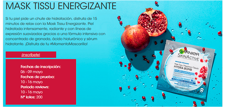 No te puedes perder lo que nos trae Garnier esta vez: Da a probar gratis ¡la Mask Tissu Energizante! Consiste en una innovadora mascarilla que aporta hidratación y relajación al rostro en tan sólo 15 minutos. El resultado que da es una piel hidratada, radiante y con líneas de expresión suavizadas gracias a una fórmula intensiva con concentrado de granada, ácido hialurónico y sérum hidratante. Pues bien, ¡ahora lo dan a probar gratis a 200 afortunad@s! Qué buena pinta 🙂 El último día para participar es el 9 de mayo de 2019. Si te gustaría probar gratis la Mask Tissu…