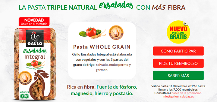 Más buenas noticias: ¡Dan a probar gratis Pasta Gallo Ensaladas Integral! Se trata de una nueva variedad de pasta elaborada con vegetales y con las 3 partes del grano de trigo: salvado, endospermo y germen. Es rica en fibra y fuente de fósforo, magnesio, hierro y postasio. ¡Y este año la dan a probar gratis a través de reembolso a los primeros que se animen en participar! Esta promoción es válida en toda España hasta el 31 de diciembre de 2019 ó fin de reembolsos, ¡reparten hasta 7.000 reembolsos! Para poder probar gratis Pasta Gallo Ensaladas Integral puedes seguir los…