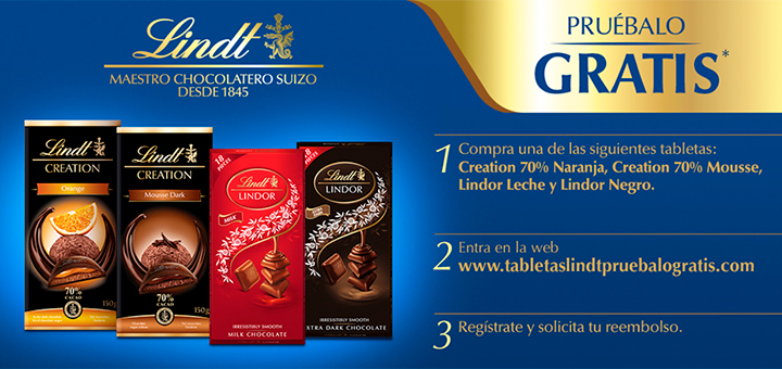 Atención a esta promoción tan interesante porque… ¡Dan a probar gratis tabletas Lindt! Con chocolate negro o con leche. Lindt ofrece una amplia variedad de recetas que sus Maestros Chocolateros desde 1845 han creado para sus fans: Tabletas de chocolate, bombones, figuras de chocolate… Pues bien, ahora están dando a probar gratis algunas de sus tabletas de chocolate a través de reembolso :p Los productos promocionales son: Lindor Singles Leche, Lindor Singles Negro, Creation 70% Naranja, Creation 70% Mousse. Esta promoción es válida en toda España hasta el 30 de junio de 2019 ó fin de existencias, ¡repartirán hasta 6.200…