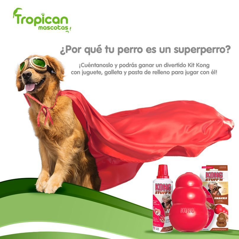 Tropican mascotas te trae un magnífico sorteo, gana un divertido Kit Kong que incluye un Juguete Classic, Galleta y pasta relleno solo por contarnos porque tu perro es un superperro